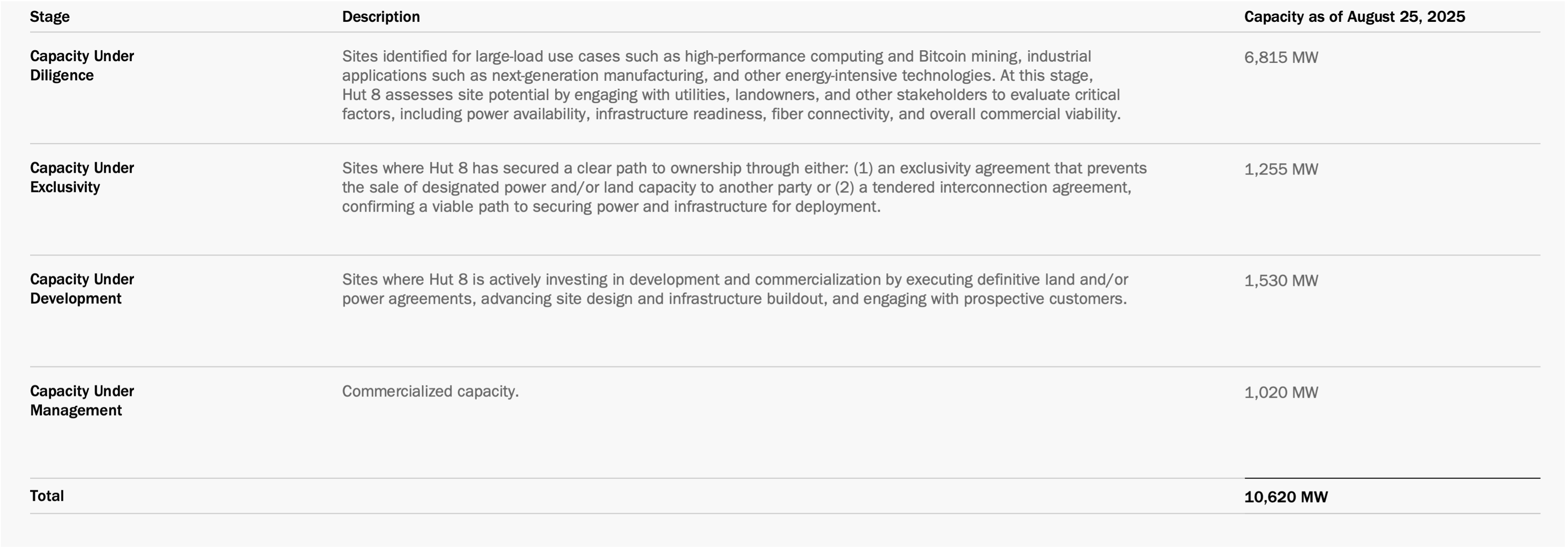 In conjunction with the launch of this expansion, Hut 8 has introduced a new category to its development framework: Capacity Under Development. This designation applies to late-stage projects that have advanced beyond exclusivity, where Hut 8 is actively investing in site development and commercialization by executing definitive land and power agreements, advancing site design and infrastructure buildout, and engaging with prospective customers. Projects in this category, including those announced today, will transition into Capacity Under Management once commercialized.